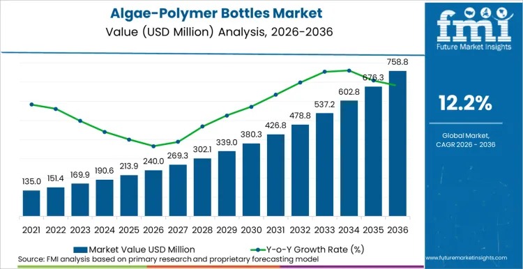 NEWARK, DE, UNITED STATES, February 13, 2026 /EINPresswire.com/ -- The global Algae-Polymer Bottles Market is forecast to expand from USD 240 million in 2026 to USD 760 million by 2036, registering a CAGR of 12.2%, according to Future Market Insights (FMI). The sector is transitioning from niche, pilot-scale commercialization toward structured adoption across beverage, personal care, and FMCG industries as regulatory and environmental pressures intensify.