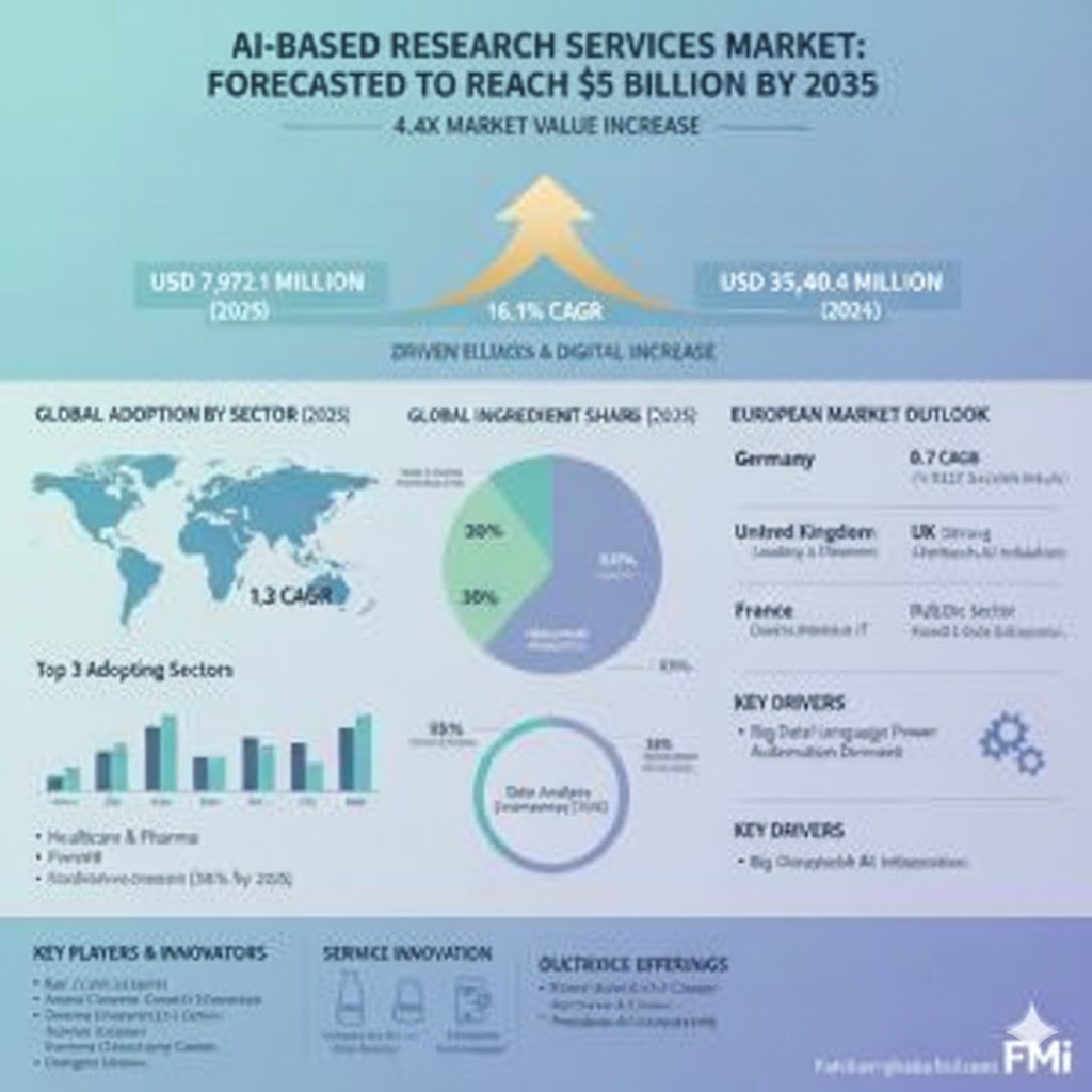 NEWARK, DE, UNITED STATES, October 13, 2025 /EINPresswire.com/ -- The AI-based Research Services market is set to experience remarkable growth over the next decade, with a projected global valuation of USD 7,972.1 million in 2025 rising to USD 35,420.4 million by 2035. This represents a 344% increase and a robust CAGR of 16.1%, underpinned by technological adoption in Europe and Asia-Pacific (APAC). As enterprises increasingly seek faster consumer insights and predictive analytics, these regions are emerging as pivotal growth engines for AI-enabled research services.