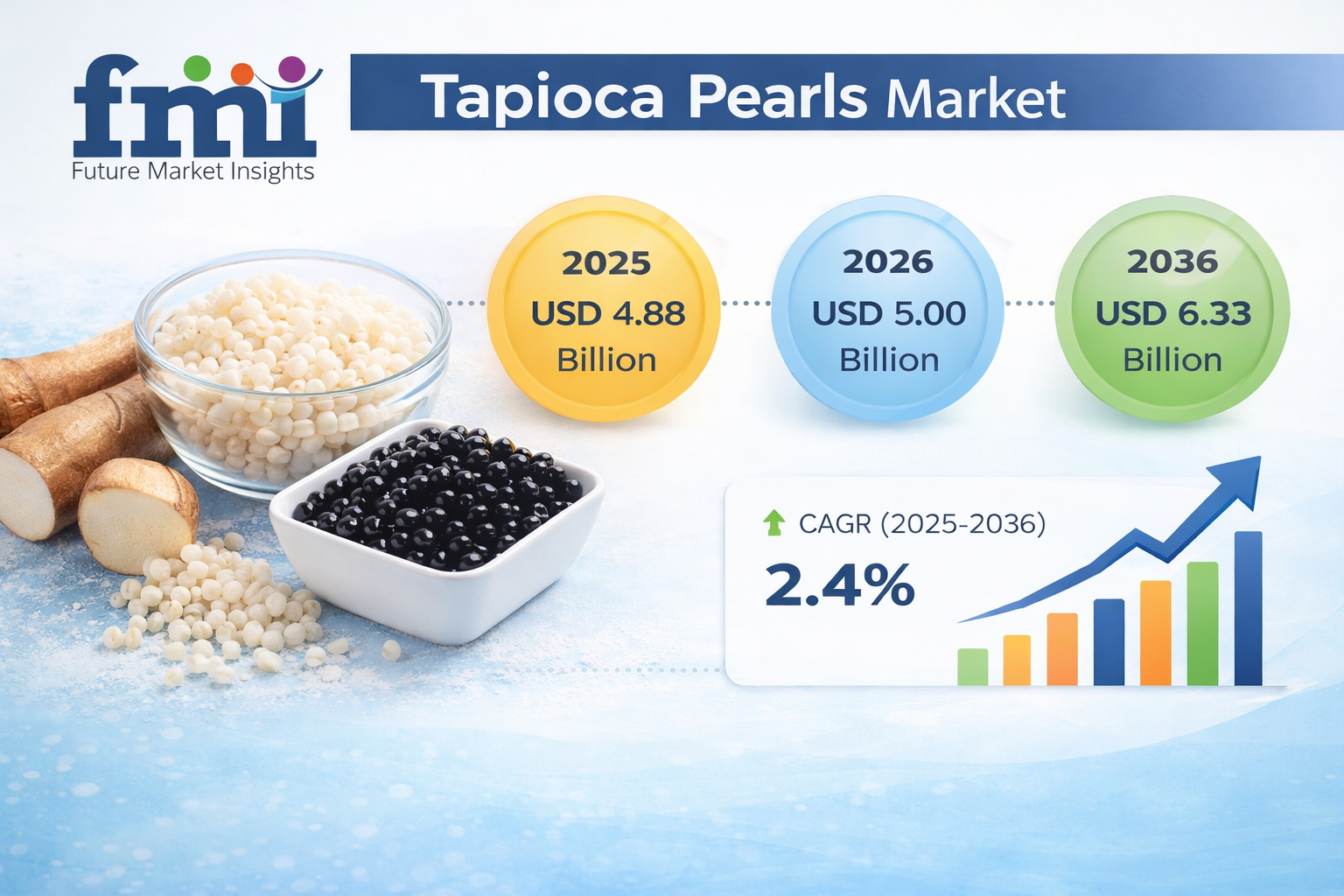 According to a comprehensive strategic outlook released by Future Market Insights (FMI), the global Tapioca Pearls Market is projected to grow from USD 5.00 Billion in 2026 to USD 6.33 Billion by 2036, reflecting a CAGR of 2.4%. Growth opportunities are underpinned by the global expansion of bubble tea retail chains, rising B2B procurement, and increasing adoption in beverages, desserts, and foodservice channels.